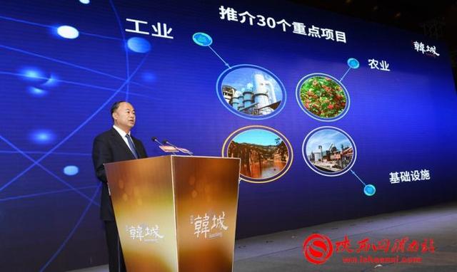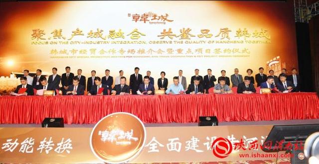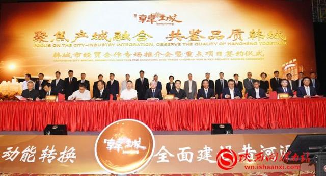 一年来,韩城聚焦“三个经济”,全面加快黄河沿岸区域性中心城市建设,加快产业转型升级步伐,突出“以产促城,以城兴产,产城融合”,围绕能源化工、装备制造、基础设施、文化旅游等领域,精心策划包装了243个项目,总投资达1703亿元。在韩城专场推介会上签约了32个项目,分别是重点基础设施项目、余热综合利用项目、城市综合服务项目、陕西省韩城市与吉林省梅河口市战略合作协议项目、世纪金花奥莱城项目、125吨轧钢项目、中企云链“保理e融”产品项目、嘉晖100兆瓦风力发电项目、新型绿色环保包装材料项目、东旭能源分散式风力发电项目、新能源电动汽车充电站基础设施项目、大气污染治理设备制造及研发项目、水资源综合利用项目、北京鸭文化体验中心项目、辣椒酱深加工项目、药食同源种植加工及科研项目、龙首源农业水产培育项目、古城地热能综合利用项目、味行天下调味品加工及深加工项目、年产40万吨石膏粉及4000万㎡纸面石膏板生产线项目、5万吨/年钒冶炼及新材料项目、10万吨绿色低碳甲醇项目、电视剧《让爱灿烂》文化项目、265㎡烧结烟气综合治理项目、年产一万吨香料精加工项目、韩城形象IP文创产品项目、龙门物流园区项目、年处理70万吨建筑垃圾生产线项目、韩城市芝水返乡创业示范基地项目、东投新能源90兆瓦分散式风力发电项目、天惠亿购农村社区电商项目、世纪金花韩城星光城项目。