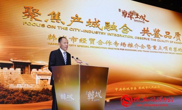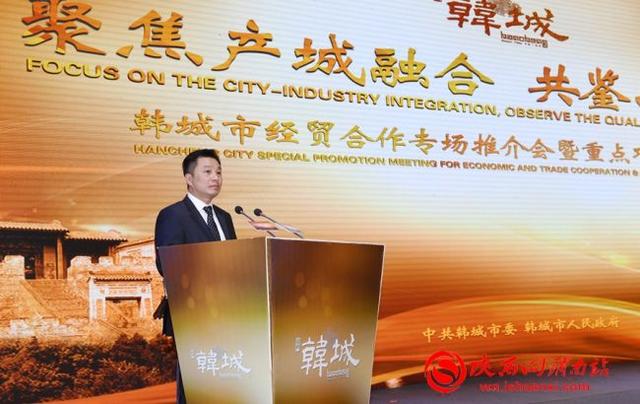 会上,韩城市委副书记、市长杜鹏致欢迎辞并以“聚焦产城融合,共鉴品质韩城”为主题,用PPT图文并茂的形式,从城市区位、产业基础、政策优势等多方面,全方位介绍了韩城市工业突破的六大方向和打造六大基地的宏伟构想。他说,近年来韩城聚焦产业升级转型和城市功能提升,开启了新的经济升级转型发展历程,努力朝着建设国家循环经济示范市、打造黄河沿岸区域性中心城市、构筑陕西东大门对外开放新高地的目标迈进。韩城的升级转型,可以从深厚的历史文化中找到基因,建立在巨大发展变化基础之上,已呈现出强劲向上的发展态势,正加速带动韩城的对外开放,昭示了一个投资兴业的美好未来。韩城在投资兴业上,具有六大明显优势,即叠加的政策红利优势、良好的资源禀赋、巨大的市场潜力、扎实的产业基础、优越的营商环境、过硬的干部作风。工业始终是韩城升级转型的潜力所在,具有合作共赢的巨大比较优势。韩城紧紧依托省级经济技术开发区、省级高新技术产业开发区两大平台,坚持“优钢、升化、稳煤”产业升级转型思路,发展壮大“高端制造、绿色制造、智能制造、服务型制造”,重点打造“六大基地”,建设“结构优、技术新、效率高、活力强”的现代工业体系。