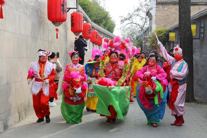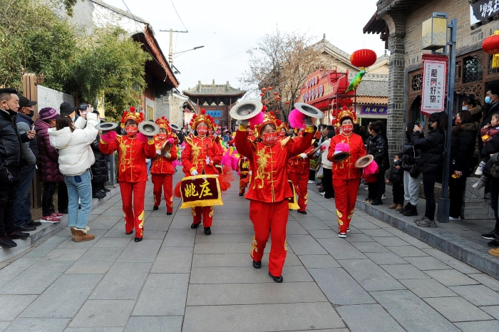 同时,专列游客在韩城将享受到贴心的旅游服务——专职导游全程免费讲解,古城三庙景区免门票参观、观看非遗节目——行鼓表演等,无一不透露着韩城民众的热情好客。游客走在古城,社火、秧歌、踩高跷……喜庆的韩城阵鼓传遍大街小巷,让他们目不暇接,纷纷或拿出手机留下精彩的瞬间,或抱起孩子共享这难得的欢乐时光,体验这里热闹而浓浓年味。状元府、民俗博物馆、史记文化街区是必不可少的景点,情景剧《状元回府》更是不容错过。年近八旬的“王杰”精神矍铄、步履稳健,面带微笑向游人挥手。游客们和扮演“王杰”的乡党进行沉浸式互动,前拥后簇,把“王杰”送回状元府。