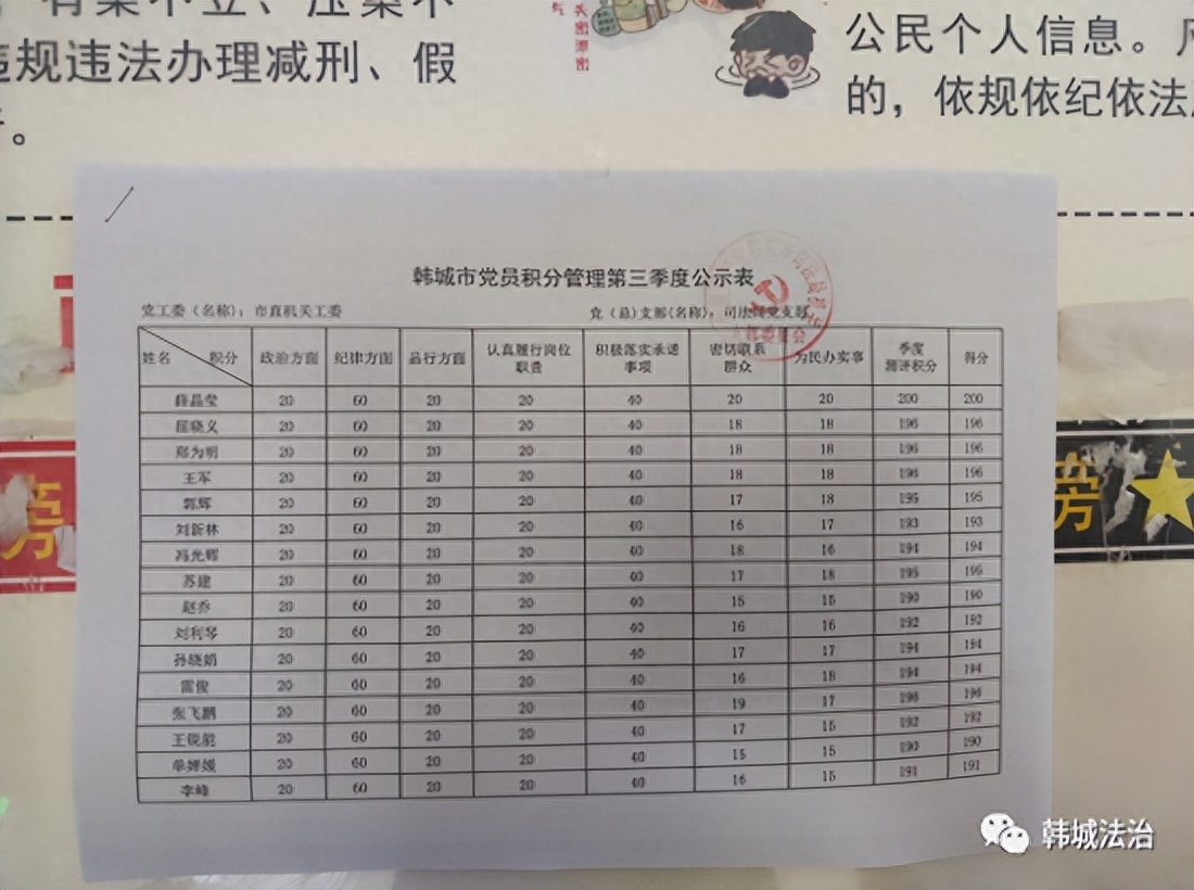 近日,韩城市司法局机关党支部对第三季度党员积分进行了公示。