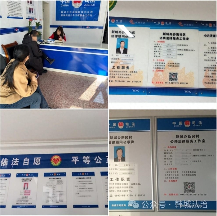 新城司法所共设立1个公共法律服务站、29个公共法律服务工作室,以街道平台为依托、社区平台为桥梁,积极建设立体化公共法律服务实体平台。搭建的每一个公共法律工作室,公示了机构组成、工作职责、二维码扫描在线服务,监督电话等使群众更加明晰公共法律工作室的工作职责及性质。将法律援助的工作流程、受理范围全部上墙,确保来访群众及时了解法律援助办理程序,使制度标准化、规范化。