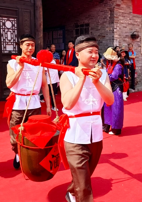 舞狮引导工作人员将封坛之酒抬入舞台,大家共同见证一项传统的仪式—封坛