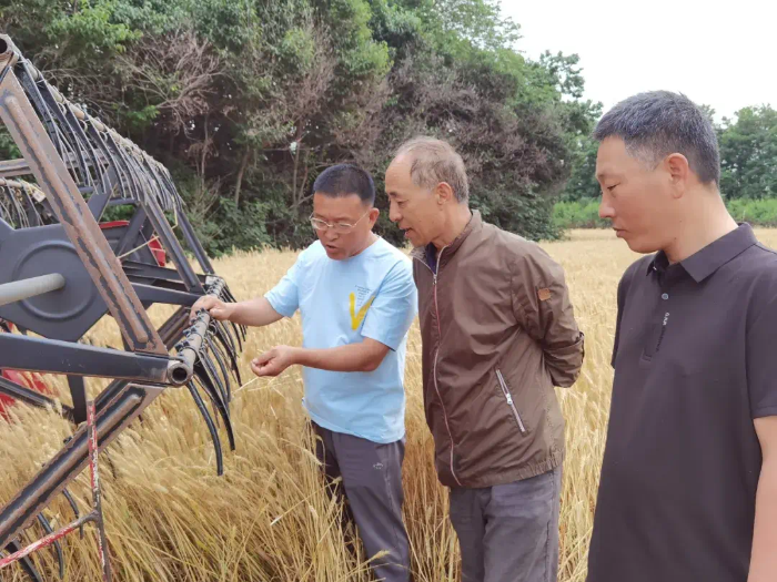 “这机具收麦刀片的调试,要处理好。间隙基本在停机的情况下,上下刀片要检查一下,松动的刀片一定要上紧,再一个是刀片快速运动,把刀架要看一下。平时这齿轮,链子,有那种一体黄油,该加的,停的时候一定要加,皮带要随时检查,也要看。”市农机中心生产技术股干部薛永强说。