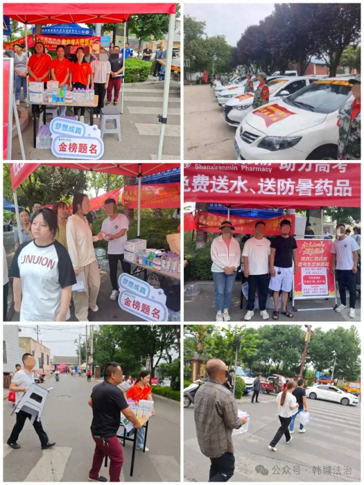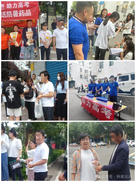 6月7日,在韩城市新城一中考场门前,多名社区矫正对象作为公益志愿者,联合陕西仁民药房、韩城双志能源公司(正泰安能)在考场门前附近设置爱心物资台,为高考学子、待考的家长们和交警等执行等助考的公务人员发放矿泉水、扇子、湿巾,包括风油精、藿香正气水等防暑降温药品物资,给考生提供安全、方便、快捷的服务。同时,协助现场的警察和综合执法大队维持考场外的秩序,保障高考的顺利进行。