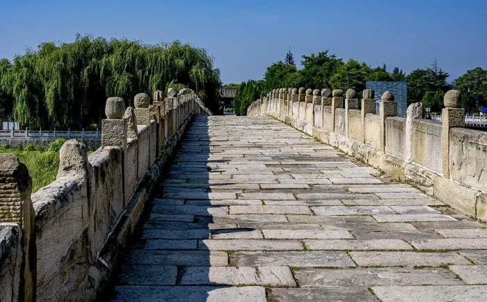 这座桥的桥面宽4.5米,净跨6.15米,长度为180米。桥体采用花岗石条砌筑,桥面呈穹隆形。石缝由灌铁水而成的铁锭加固。桥两侧有节间式青石桥栏杆,每侧有99根望柱,98块栏板。地伏是青石料,矩形断面。翼墙和侧墙上顶有单层青石仰天石组成的金边线。桥台是燕翅形,桥台呈燕翅形,桥墩呈梭形,拱碹是半圆框形纵联式结构。毓秀桥头存一尊身着元代服饰、头戴风雪帽的圆雕石人坐像,桥南有一座三连重檐歇山顶式木牌坊。