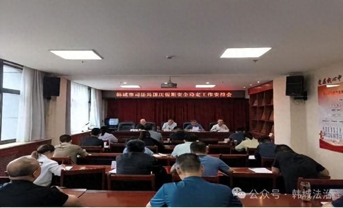 为做好国庆期间假期间的安全维稳工作,营造安全稳定的社会环境,9月29日上午,韩城市司法局召开节前安全稳定安排部署会议。局领导班子成员和各科室、法援中心公证处司法所全体人员参加了会议。
