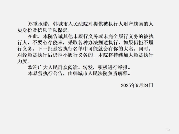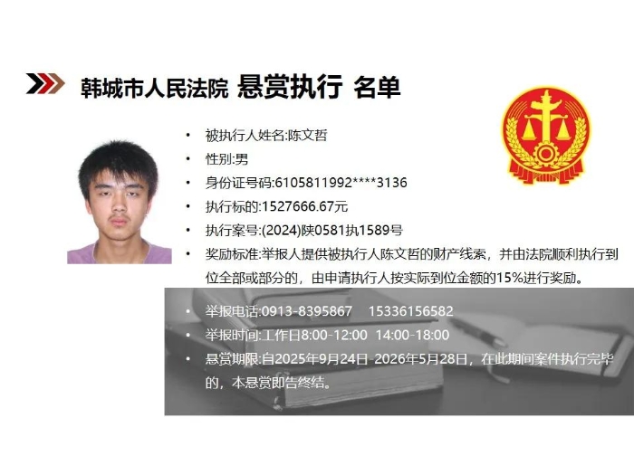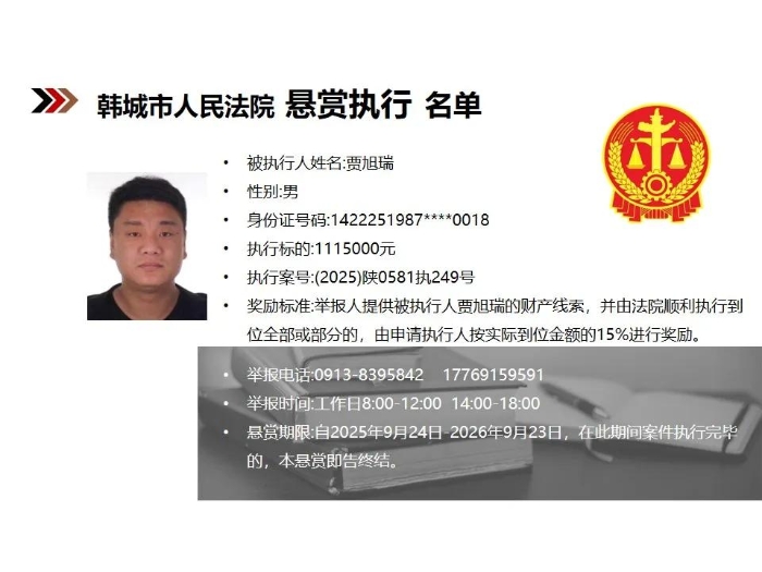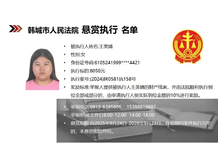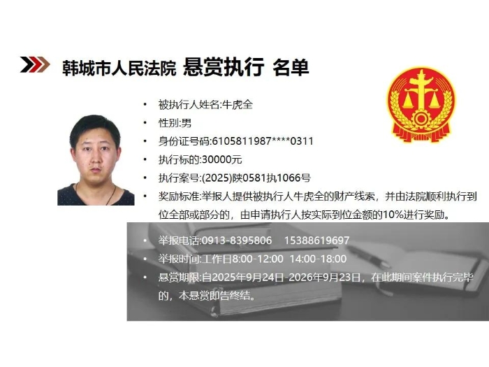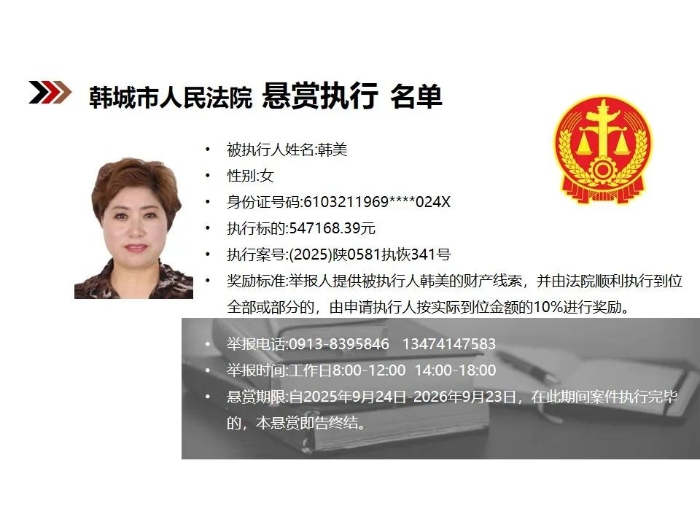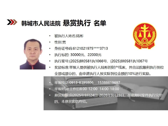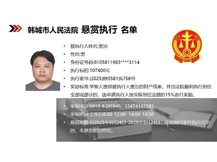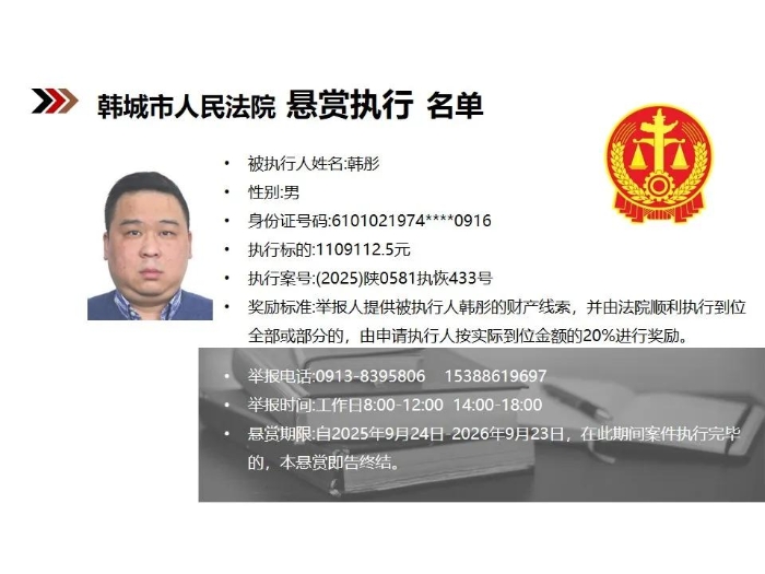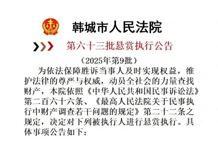 【悬赏执行】韩城市人民法院2025年第9批悬赏执行公告