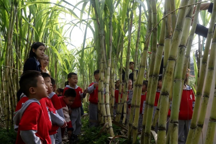 采访当日,恰逢当地幼儿园师生在蔗田中开展研学活动。孩子们穿梭于蔗林间,听讲解、摸甘蔗、闻甜香,欢笑声此起彼伏。这片蔗林,不仅成为孩子们认识自然的生动课堂,更承载着当地农户对未来的期待——或许在不久的将来,它会真正成为带动大家增收致富的 “甜蜜事业”。