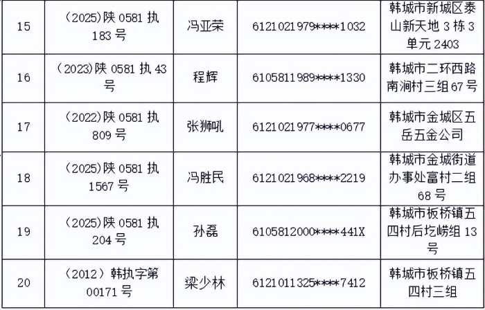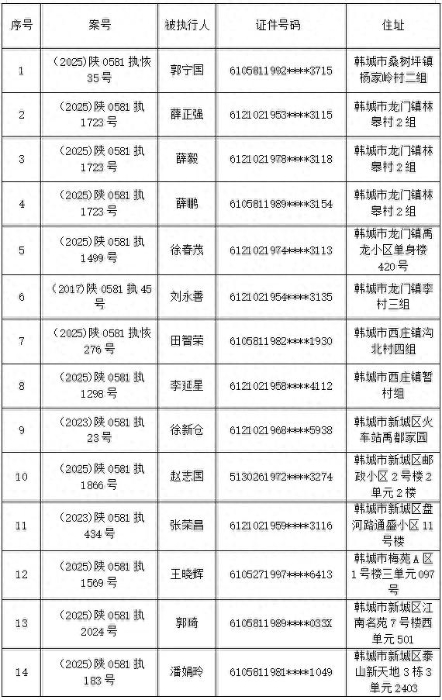 韩城市人民法院关于集中发布司法拘留的公告