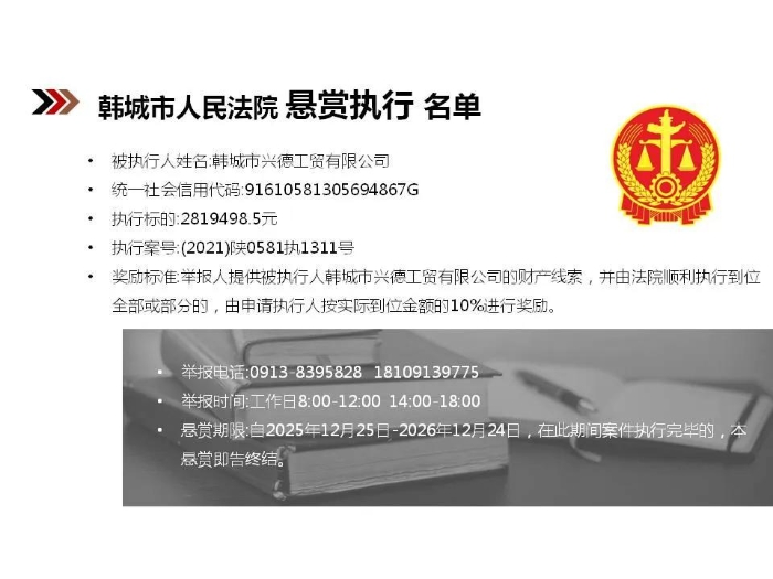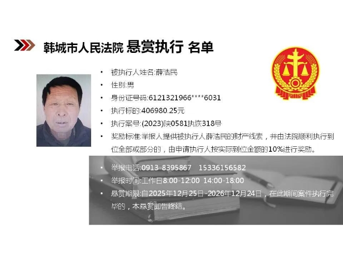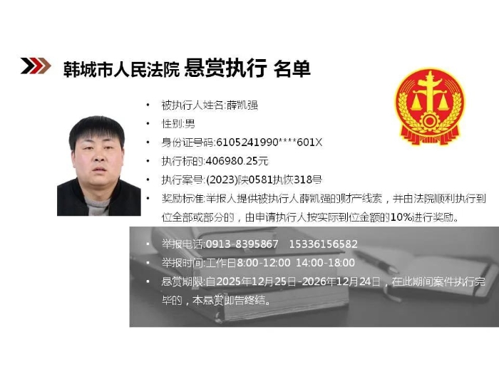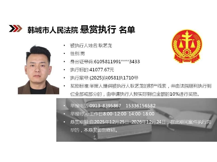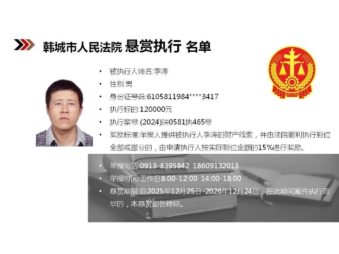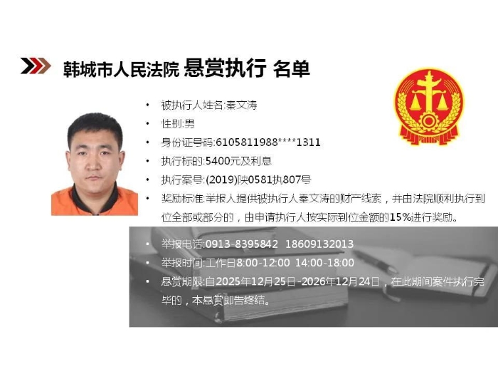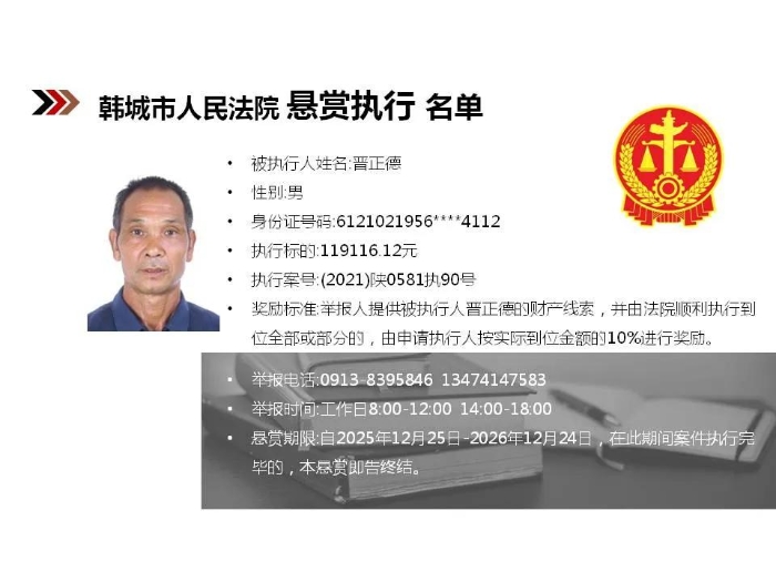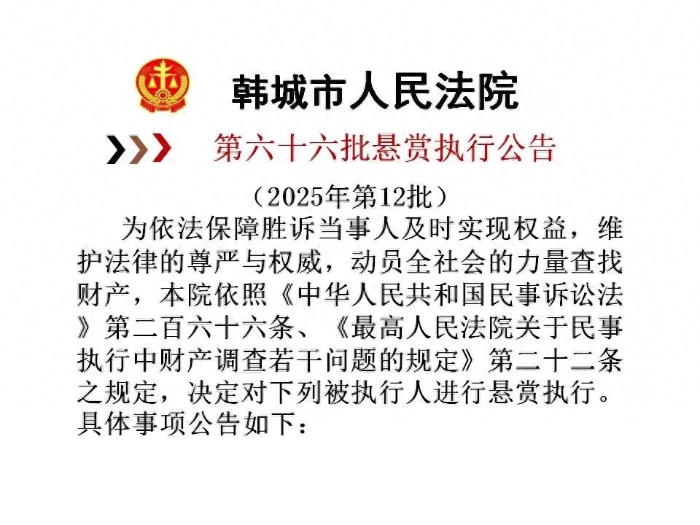 【悬赏执行】韩城市人民法院2025年第12批悬赏执行公告