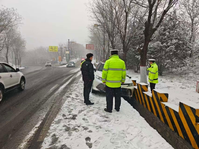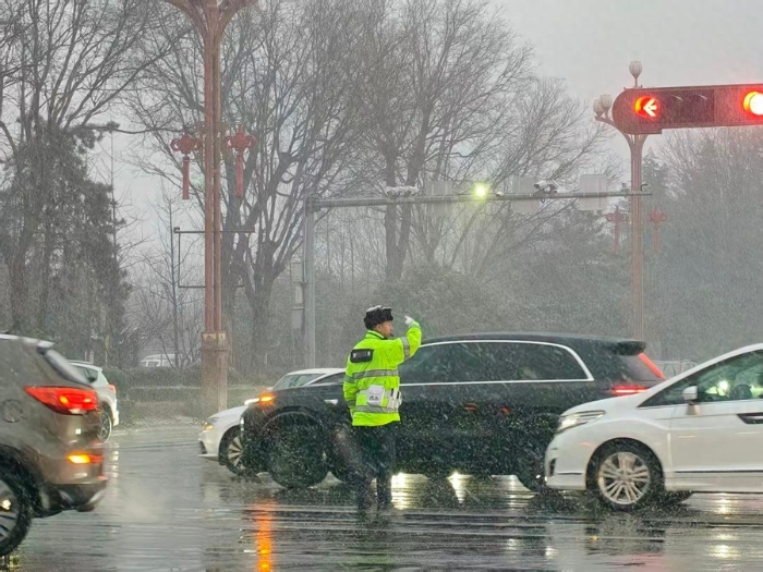 城区主干道与关键路口,身着荧光服的民辅警顶风冒雪,化身风雪中醒目的“路标”,有序指挥车辆减速慢行、保持安全车距。国省道及乡村道路沿线,民辅警设置临时警示标识,逐一对过往车辆提醒雪天行车注意事项,遇打滑受困车辆时,更是徒手帮忙脱困,暖心举动赢得群众连连点赞。