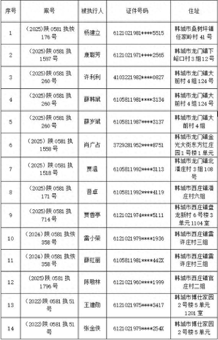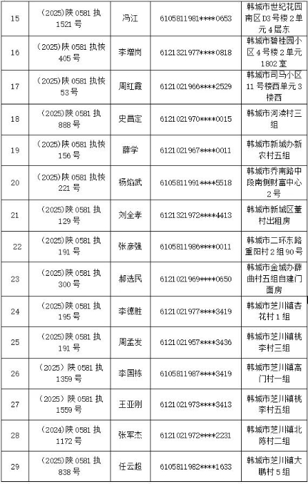 人民法院执行工作是依靠国家强制力确保法律全面正确实施的重要手段,是维护人民群众合法权益、实现公平正义最后一道防线的最后一个环节。人民法院在依法保障胜诉当事人合法权益同时,最大限度减少对被执行人权益的影响,实现法律效果与社会效果的有机统一,是维护社会公平正义、促进社会和谐稳定的必然要求。下列被执行人,本院已作出司法拘留决定书,现将名单(包括已发布司法拘留公告仍拒不履行的被执行人)予以公布,凡在2026年2月1日前主动履行义务或积极与申请执行人协商,达成执行和解协议将问题予以妥善解决的,本院会秉承善意文明执行理念,视情节予以从轻处理,逾期仍拒不履行的,本院将坚决予以司法拘留;届时,本院将通过微信、抖音等多种形式,发动全社会的力量寻人找人,使被执行人无处遁形。同时,正告其他以各种方式逃避执行、规避执行、抗拒执行的被执行人,不要心存侥幸,保持清醒的头脑,积极主动履行义务,否则,所引发的一切后果只能自行承担。