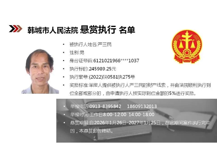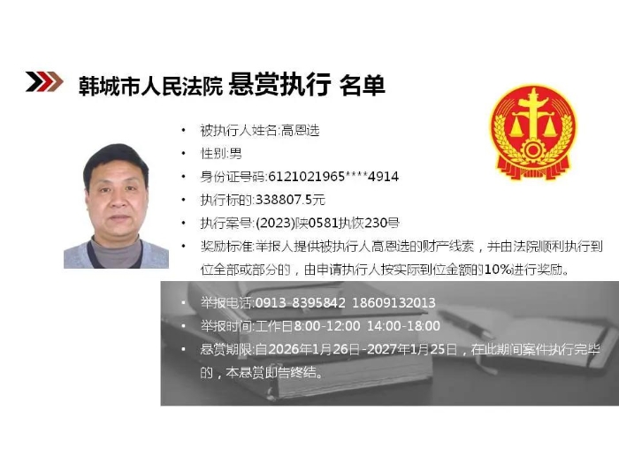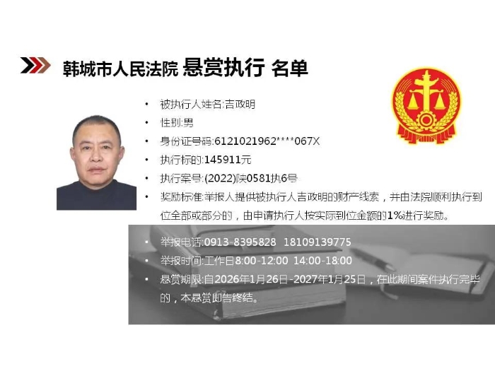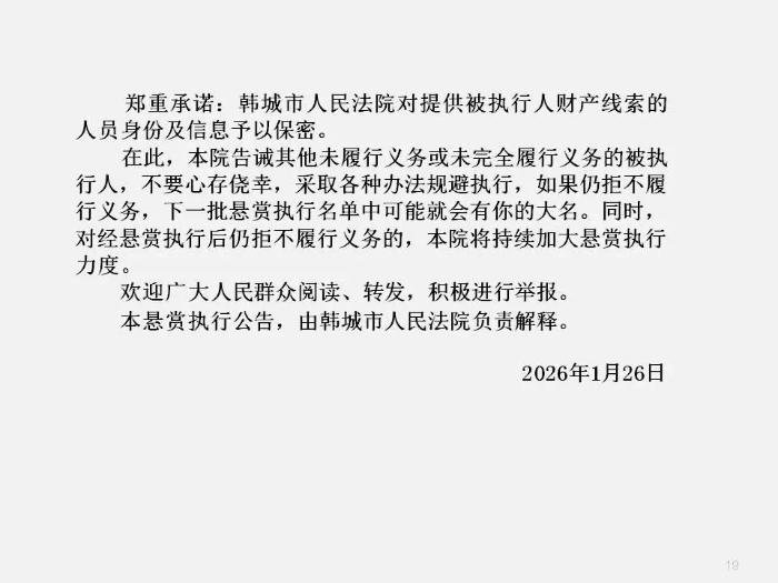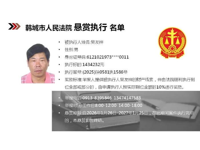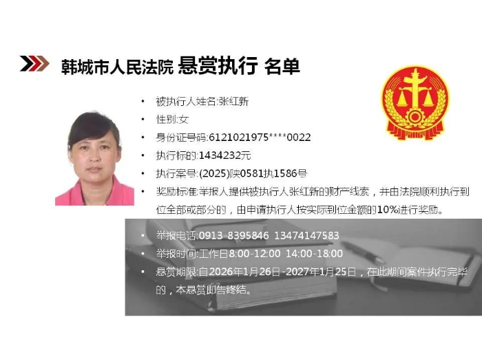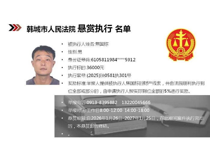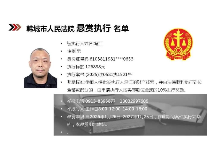【悬赏执行】韩城市人民法院2026年第1批悬赏执行公告