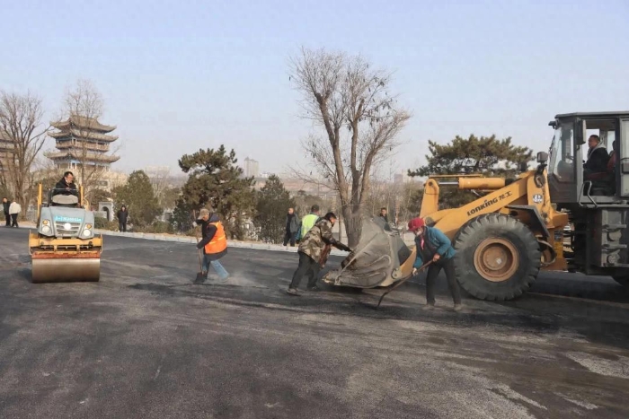 1月27日,在老城区环城南路至原108国道澽水河桥道路连通工程项目施工现场一片繁忙。冒着白烟的沥青从铲车上接连卸下,十余位市政工人分站两侧、分工协作,手持铁铲将沥青细致摊铺平整;三辆压路机来回穿梭,对新铺路面反复碾压夯实,确保路面平整牢固。