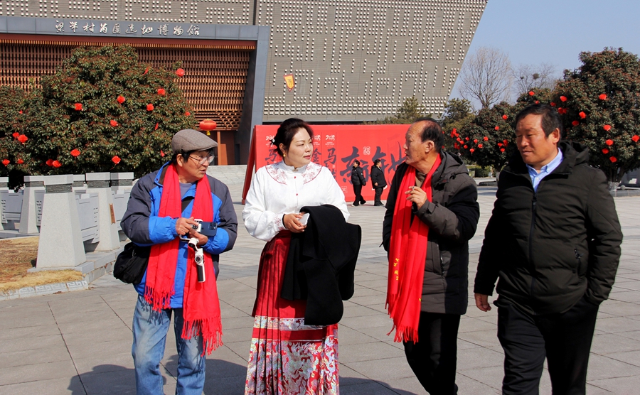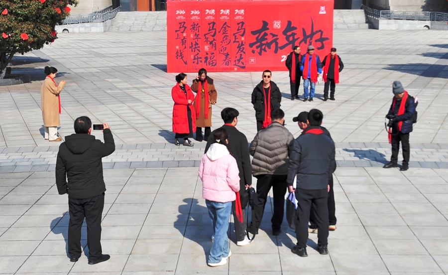 从三庙景区的古意盎然到梁带村芮国遗址博物馆的庄重大气,会员们马不停蹄,只为用光影记录韩城的多元魅力。芮国博物馆前的广场上,“新年好”的红色版面与西周建筑的几何美感碰撞出独特的视觉张力,会员们在此合影留念,将对韩城文旅的热爱定格成永恒的画面。赵莉馆长的热情互动,更让这场拍摄有了双向奔赴的温暖——她分享在三亚的摄影经历,提出与分会深度协作的设想,让“光影赋能文旅”从理念走向了实践。