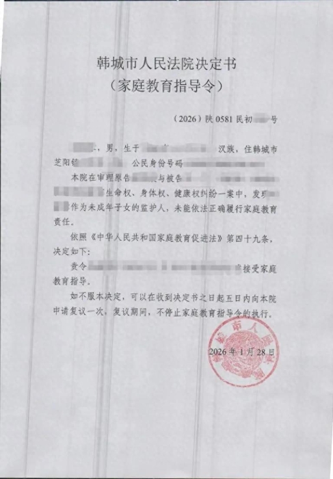 2026年1月底,芝阳人民法庭在审理一起生命权、身体权、健康权纠纷案件时,发出了2026年首份《家庭教育指导令》。这份文书,承载着法治力量对青少年成长的深刻关切。