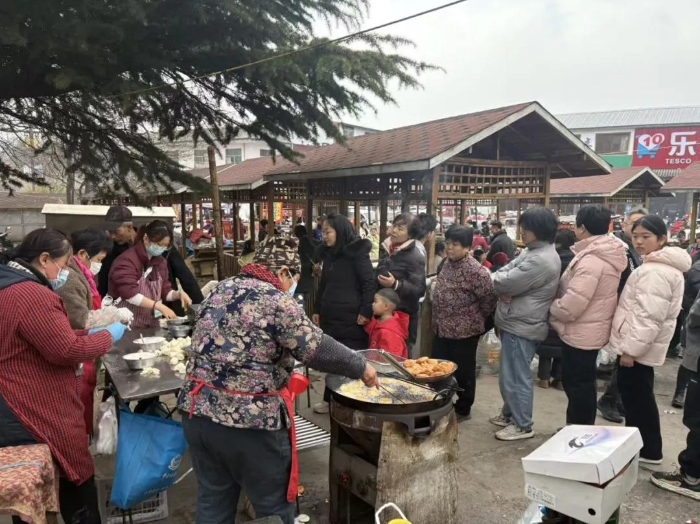 清晨时分,整条集市早已热闹起来。红彤彤的对联福字、烫金的春联窗花铺成喜庆海洋,新鲜果蔬带着晨露,整扇猪肉悬挂架上,韩城大红袍花椒及花椒油、花椒酸奶等百余种精深加工品琳琅满目,成为集市上的“硬核年味”。小吃摊前热气腾腾,五毛钱一个的炸油糕外酥里糯,刚出笼的甑糕甜香四溢,羊肉饸饹、白面饸饹、页面等本地美食香气扑鼻,吸引人们纷纷排起长队。